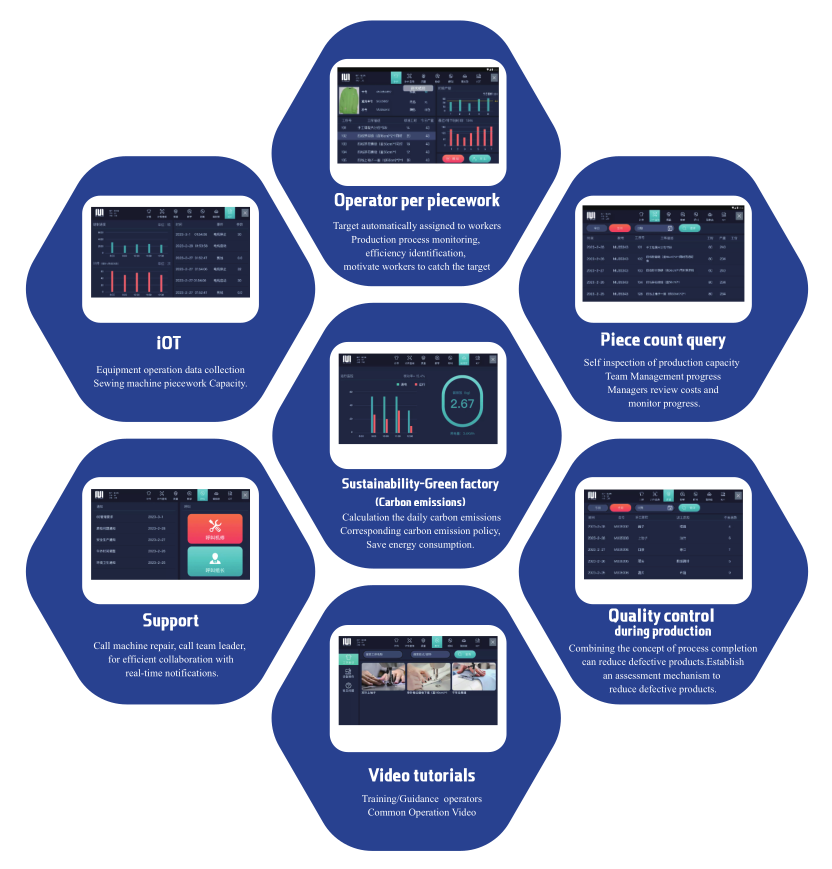 By interconnecting with sewing machines, precise control of the process and energy consumption can be achieved. Mechanical maintenance personnel, equipment operators, and equipment management personnel are interconnected to improve the efficiency of human-machine collaboration.